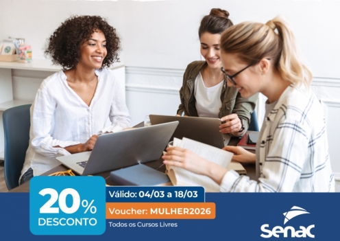 Pensado nisso, todos os cursos livres da plataforma estão com 20% de desconto até o dia 18 de março de 2026. As inscrições podem ser feitas pelo site do Senac EAD, e os descontos são aplicados na hora da matrícula, com o voucher MULHER2026.